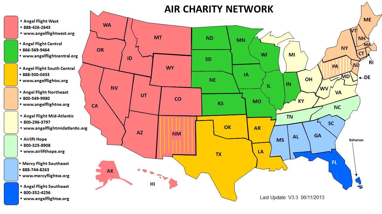 Angel Flight West (Alaska, Arizona, California, Colorado, Hawaii, Idaho, Montana, Nevada, New Mexico (shared), Oregon, Utah, Washington, Wyoming)